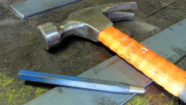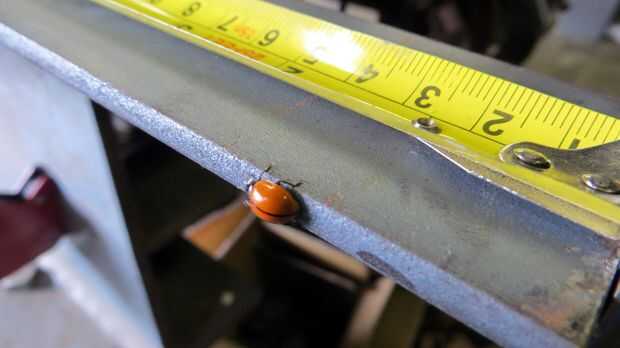 Decidí usar el mismo material para las correas que para el corredor de peldaños: 2 "x 3/16" barra plana. Aquí estaba haciendo la primera cinta, aún no sabiendo si va a haber dos o tres en total. Empecé por tomar un momento para apreciar el escarabajo asiático (una especie invasora que se confunde a menudo confundida una mariquita) arrastrándose a través de mi trabajo.