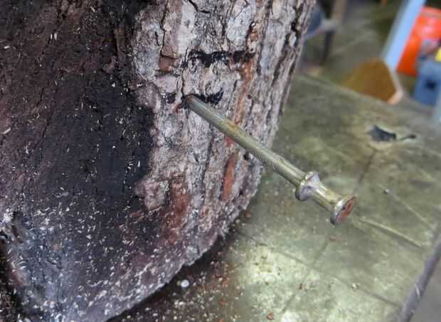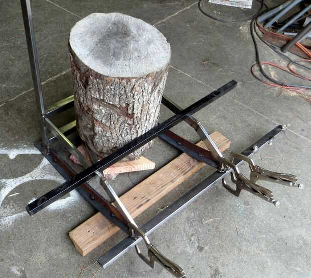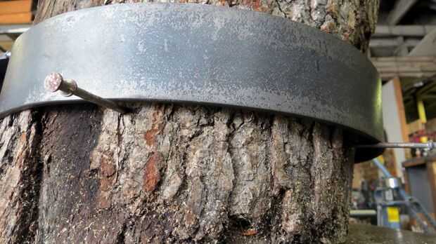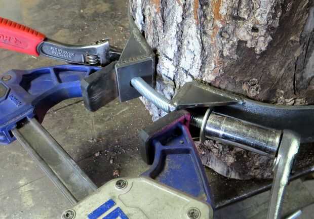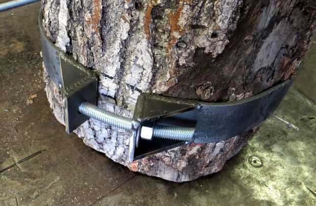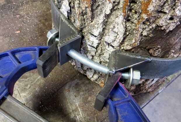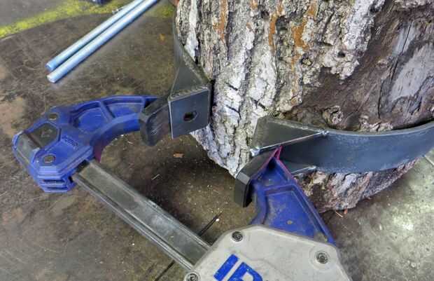 Para determinar la ubicación de la primera cinta, que escenifica todas las piezas y algunas marcas de rotulador en el tocón. He utilizado estas marcas para tres clavos temporales se hunden en el muñón para la correa para descansar en mientras aprieta. Utilicé una pinza para la correa lo suficientemente apretada como para el tornillo curvo se deslice en. Pronto me di cuenta de que la soldadura de las tuercas en su lugar sería útil. Una o dos veces tuve que cortar el tornillo más corto como maxed hacia fuera del alcance de mi llave.