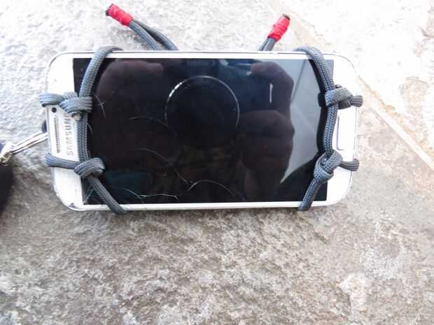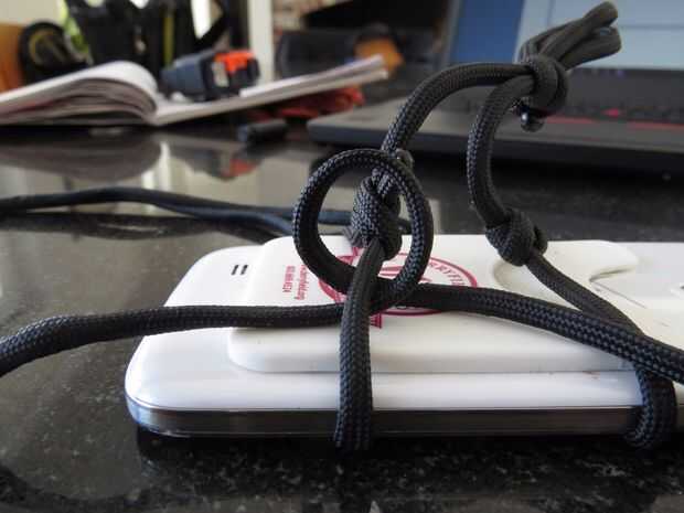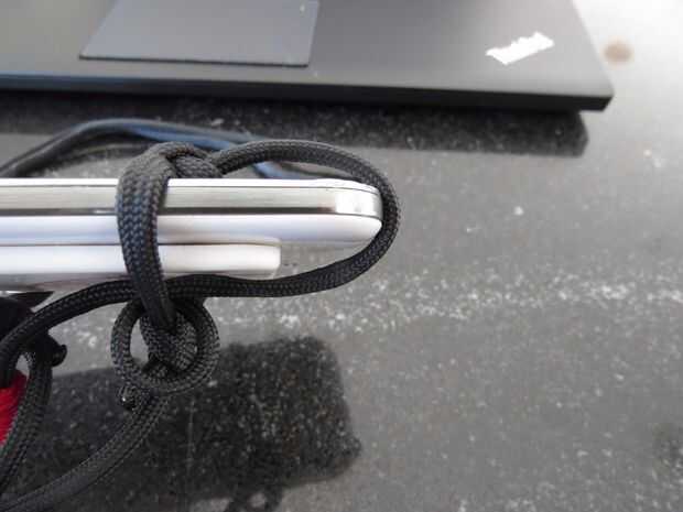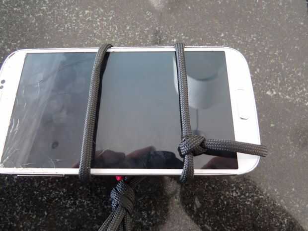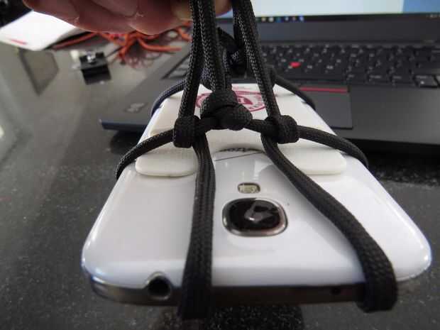 2. tomar uno de 9 y una longitud de media pulgada y envuélvalo en un círculo (debajo y luego sobre como en la imagen) alrededor de un lado del lazo de nudo deslizante en la parte posterior del teléfono.