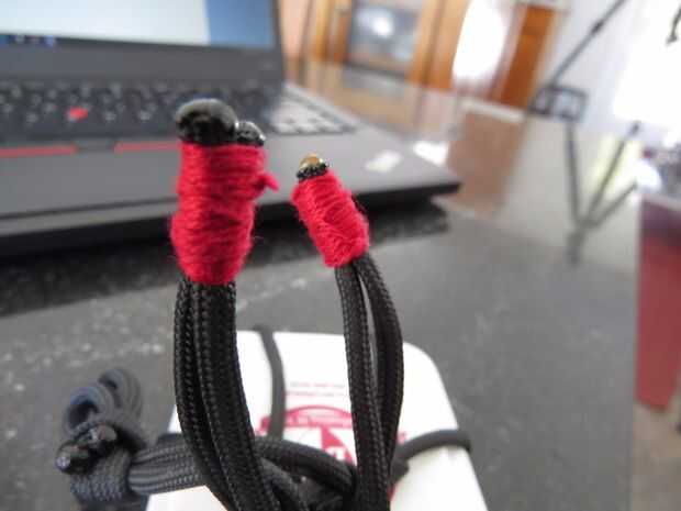 2. Coloque frente a extremos de las "líneas exteriores" a través de cada orificio del cable de bloqueo--así dos cuerdas en cada agujero. Podría tomar algunos empujando y empujando, pero 1/8" cuerda de paracaídas, es a través de.