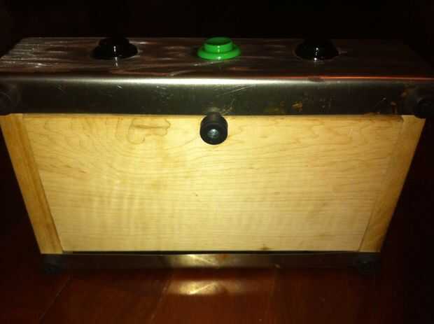Luego corté un trozo de madera del ancho de la parte inferior de mi caja, entre las partes. Puse 2 tornillos en desde el lado por lo que podía voltear abierto para acceso de la batería.