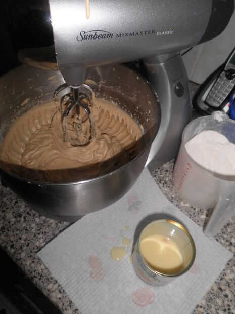Step 3. Ponga la batidora a una velocidad más baja y agregue la harina y la leche condensada a través de alteraciones en el sistema.
