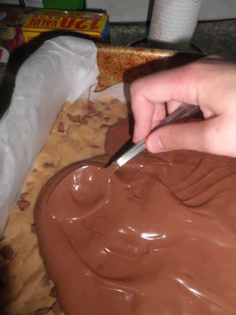 Verter el chocolate sobre el segmento refrigerado y espárcelo de forma pareja, poner en la nevera durante otros 20 minutos o hasta que esté firme.