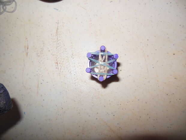 primero lo primero, necesita crear el perímetro de la pulsera, coloque su primera banda de cualquier color y colocar desde el centro a la izquierda y desde el centro a la derecha, así como en la imagen. Luego tomar cualquier banda del color de su ele