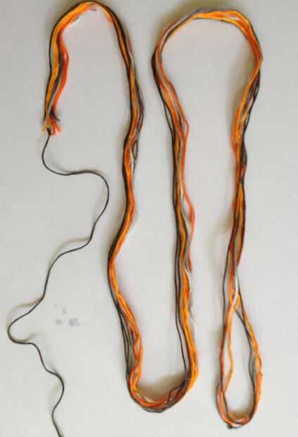De todos los 5 colores necesita hilos de cerca de 2 metros doblados por la mitad haciendo 10 hilos de 1 metro. Usted tendrá que hacer uno de los hilos de unos 20 cm de largo, se utilizará para el bucle al principio.