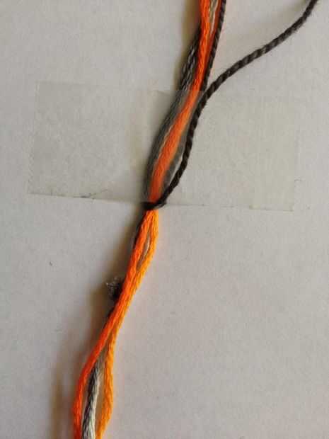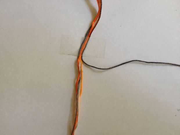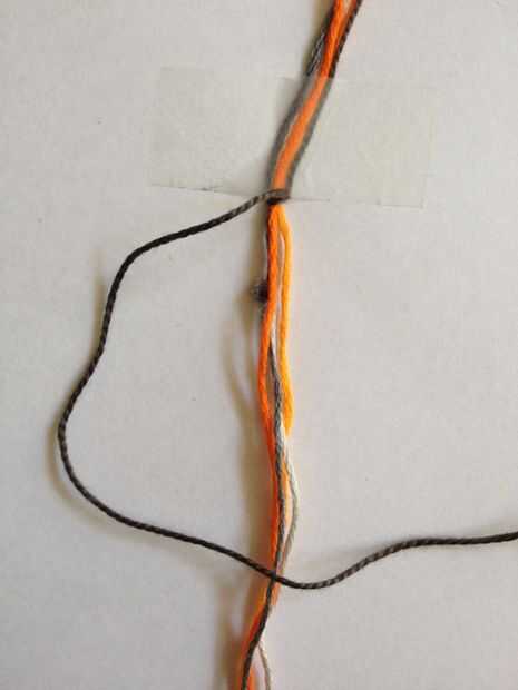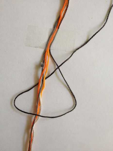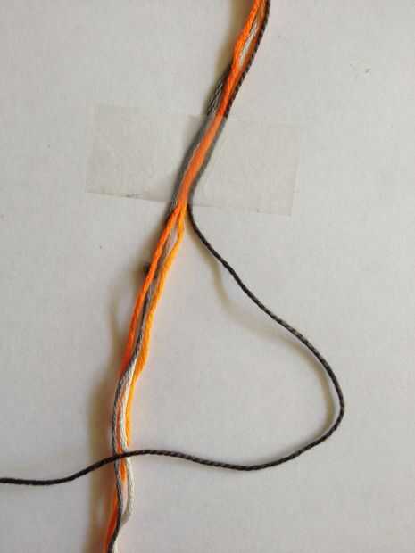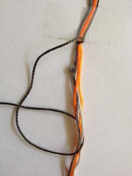 Utilizar este principio en todas mis pulseras anudan porque permite a la persona que usa la pulsera fácilmente poner y tomar de la pulsera. Se puede ver un pequeño bulbo gris en las fotos pero no ves que en tu trabajo, es simplemente allí porque el cable estaba ya pre cortada a 1 metro y los nudos juntos. Si usted tiene su 5 rosca se toma la mitad de los 2 metros y pegar hacia abajo con cinta. Ahora puede toma su hilo "más tiempo" y comenzar a hacer nudos (como se muestra en la foto) alrededor de los otros hilos. Esto es hacer un lazo sobre las roscas, tirando del hilo a través de su propio lazo y después de tirando de él tanto como sea posible. Se cambia de un derecho de cara a un nudo a un lado izquierdo hasta tener unos 3 cm. Ahora te retiras las roscas de la pieza de trabajo anudado en forma de bucle y pegar hacia abajo.
