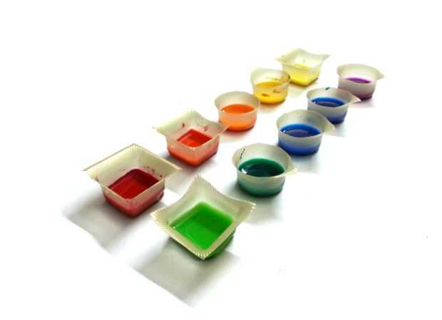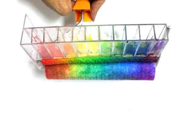 En el primer intento, usé acuarelas que hicieron que absorbe a través de la esponja en el rodillo y forma un hermoso arco iris en el rodillo, pero cuando intenté usarlo en papel, sólo dejó gotas de agua ligeramente teñida en el papel. Resulta que las acuarelas se deben aplicar espesor. Si se diluyen demasiado, no dejará un color pero gruesa pintura no será absorbida por la esponja.