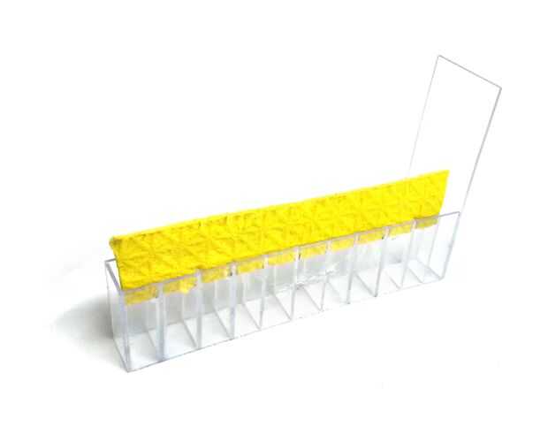 Cortar la esponja absorbente en rectángulo de 16 cm x 3 cm. Cortar unos 5mm ranuras en un lado cada 1,6 cm. Insértela en la ranura de alineación con las ranuras que acaba de hacer. Utilice pegamento para pegar el acrílico permanentemente. Esta esponja transporte la pintura al rodillo.