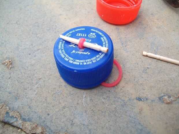 Nombre del fabricante: Shivaraju. rUbicación: Banjarapalya E4D MakerspaceMateriales:2 gomatapa de la botella de agua 2Candle(Wax)palo de escobacinta skotchHerramientas:cuchilloshorp NiloPaso 1: Tomar todos los componentes hacen agujero Toma todo el c