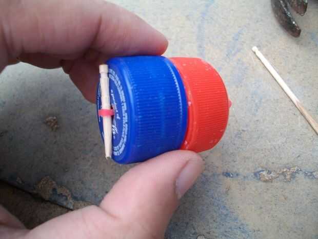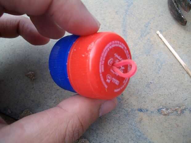 Coloque la tapa de la botella sobre el extremo y tirar la goma por ese lado