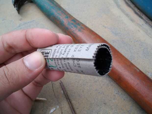 Separe las dos tapas de botellas y poner el rollo de cartón entre las dos tapas...