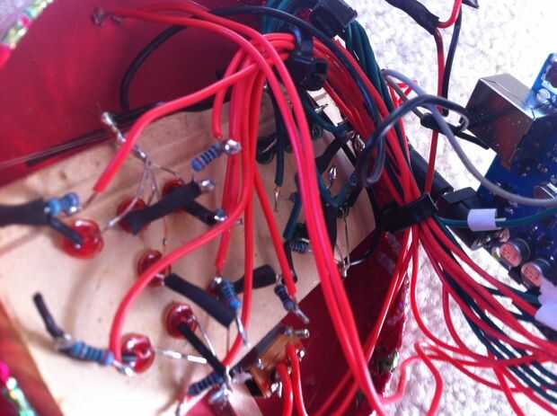 He utilizado 14 típico LED, cada uno con una resistencia de 100 ohmios en línea y conectado a los pines digitales del Arduino como sigue: