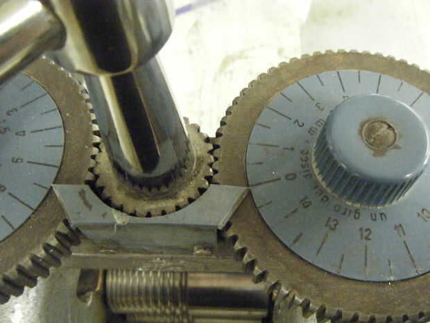 Utilizando el lápiz, dibujar líneas de registro en el engranaje de centro y uno de los engranajes exteriores. Levantar los rodillos lo suficientemente altos como para eliminar el metal, luego bájelos hacia abajo hasta que las líneas de registro coinciden una vez más. Ahora los rodillos se establecen en el mismo espesor de metal; siempre es el punto de partida.