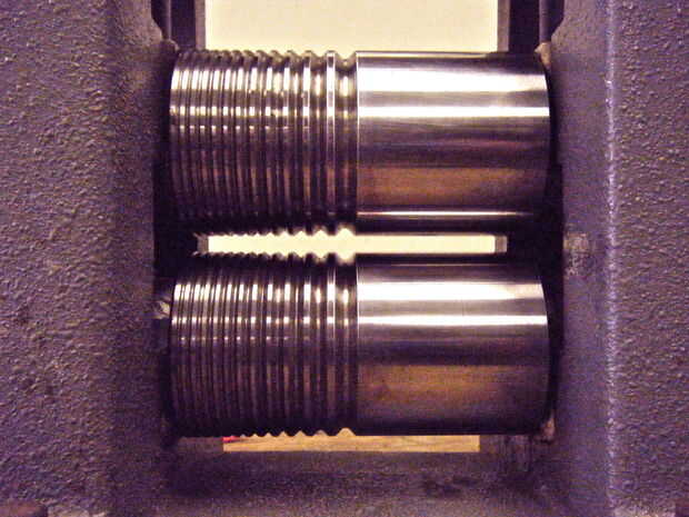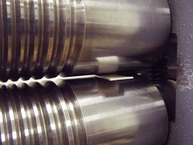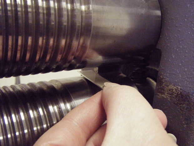 Un bonito molino de balanceo nueva tiene diales en las ruedas dentadas con números que pueden girar. Esto le permitirá fijar fácilmente la tensión. Pero falta mi viejo molino de balanceo utilizado comprado así que usar el método del lápiz. Si tu molino de balanceo todavía tiene la marca; en lugar de marcar con lápiz, apriete el metal entre los dos rodillos y mover bien el dial a la izquierda o derecha en cero; no ajuste este una vez. Abrir los rodillos lo suficiente para quitar el metal, luego cerrar los rodillos hasta volver a cero.