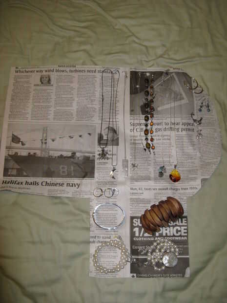 Me elaborado por una plantilla y cortarlo fuera del periódico, luego poner todas mis piezas para asegurarse de que todo tenía su lugar. Trabajando desde abajo hacia arriba, el diseño tiene 4 los bolsillos de 3 "x 4", seguidos de un rollo de anillo. La zona de arriba es para collares. La aleta del rectángulo vacío se pliega los collares de protección, luego la solapa redondeada que se mantienen pendientes se pliega. Con las aletas dobladas en, se terminan sobre las dimensiones 8.5 "x 19"