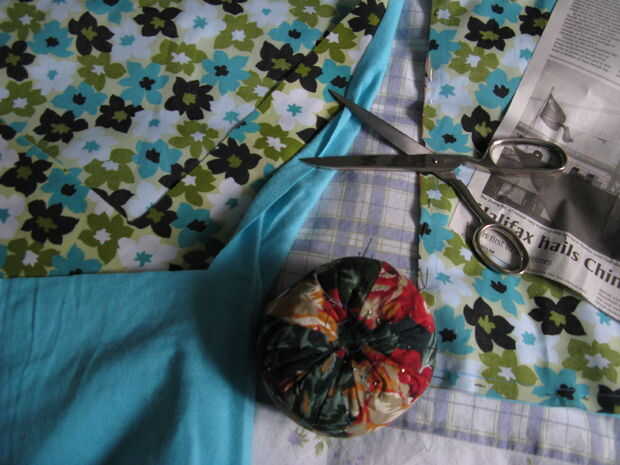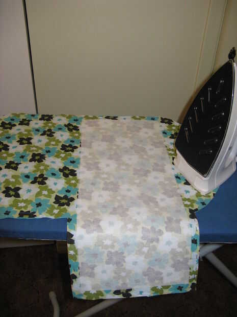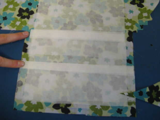 Una vez que su corte, obtener su entretela y cortar 2 piezas para la parte media del rodillo, con cada pieza que el grano va en diferentes direcciones - o si tienes entretela muy dura, sólo tiene que utilizar una sola pieza. Plancha la entretela en el interior de la tela estampada. También cortar unas tiras más finas y les planchada en adelante donde estaban ser cosidos en las tapas de los bolsillos. En retrospectiva no estoy seguro de que esto hizo mucho pero tenía un montón de conexión extra así que pensé que valía la pena intentarlo.