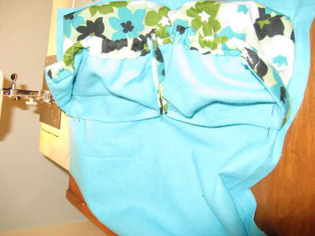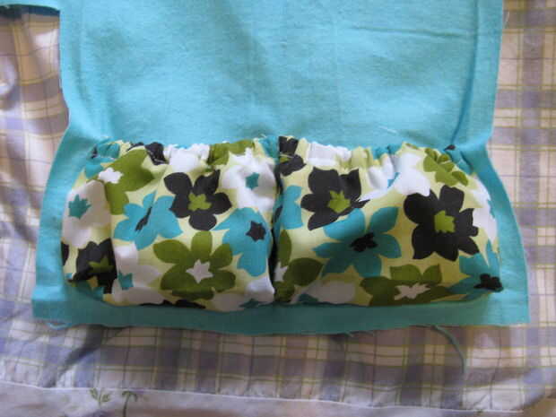 A continuación prender el borde inferior de los pares de bolsillo en lugar en el lado bueno de la guarnición y fijarlo desde el interior de la bolsa de 1/4" desde el borde. A continuación doblar el bolsillo encima, pin y coser los lados. Con el elástico en los bolsillos tienes que tener cuidado de mantener las cosas rectas.