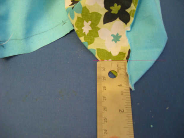 Para hacer el bolsillo "3D" Separe las 2 telas y doblar la esquina así que cuando se colocan acostadas, la esquina es tu tela estampada en uno lateral, el tejido suave en el otro lado, y la costura está corriendo por el medio (ver imagen). Medir 1" desde la punta de la esquina y coser una línea a través de la esquina (como se indica por la línea roja en la foto) luego corte la esquina dejando suficiente margen para que no salga el sticthing. Hacer esto para las esquinas de la parte 2 inferior en cada bolsillo