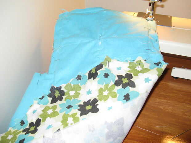 Coloque el rodillo hacia fuera plana. Doble las 2 aletas por lo que terminan con un rectángulo. Hierro y pin a lo largo del borde para sujetar las aletas en su lugar. Doble en el borde inferior y el hierro y perno en su lugar también. Coser por encima todo el rectángulo de 1/4" en el borde. Esto ocultar los bordes sin terminar en los soportes de rodillo y collar de aro y el borde inferior del sello.