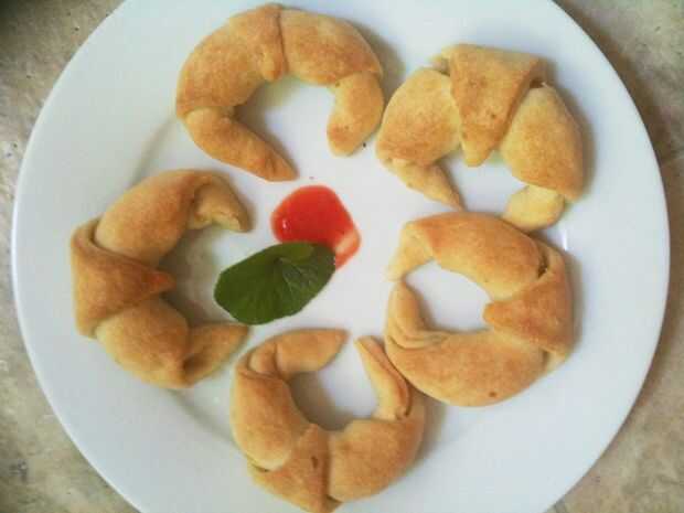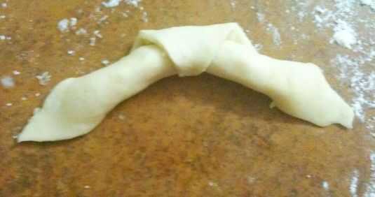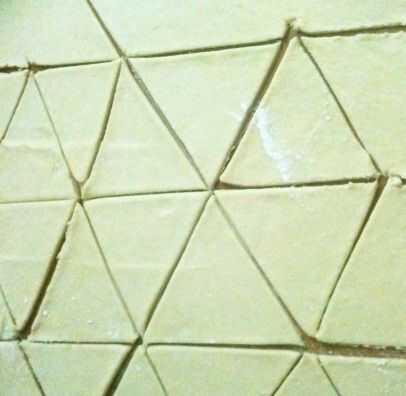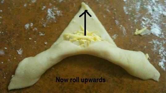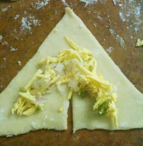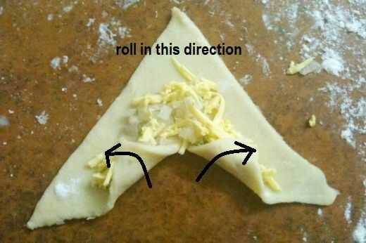 Enrolle la masa y corte en triángulos... corte un extremo al centro... Consulte fotos por favor.
