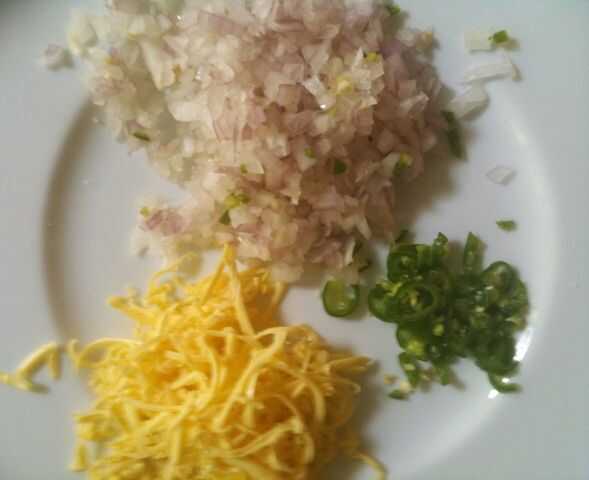 Para el relleno mezclar el queso rallado, cebolla picada y Chile verde finamente y langostinos cocidos picados finamente. Mezclarlo todo junto... Que mi amigo es el relleno... :-)