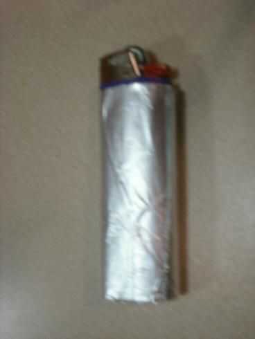cortar un trozo de papel de aluminio, suficiente para envolver alrededor del encendedor 3 veces.  Entonces firmemente enróllelo alrededor del encendedor incluyendo la parte inferior pero no la tapa de metal.
