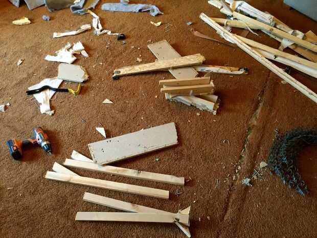 Nuestro sofá se rompió, y como suele ser el caso cuando las cosas se rompen irremediablemente, nosotros (los niños y yo) rasgó. Hemos recuperado un tesoro de tornillos, resortes, dos ruedas, un montón de madera y tela. El hardware se mantuvo, los resortes reciclado, tela rasgado para arriba para trapos y la madera aserrada leña. Bueno, casi todo de él. De la madera estaba bien y nos gusta hacer cosas, así que consiguió utilizado para los rodillos de la muñeca. Usted probablemente no quiere sacrificar su sofá; el punto es simplemente que cualquier viejos desechos de la madera están muy bien para este proyecto.