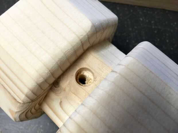 Necesitaba un pin para que los rodillos podrían llevar a cabo diferentes cantidades de peso, así que hice una mini-barra de 2 1/2"(60 mm) largo y 7/8" de diámetro (22 mm) con el mismo tipo de orificio como en el grande. Tiene el mismo tratamiento roundover como su hermano mayor.