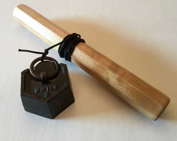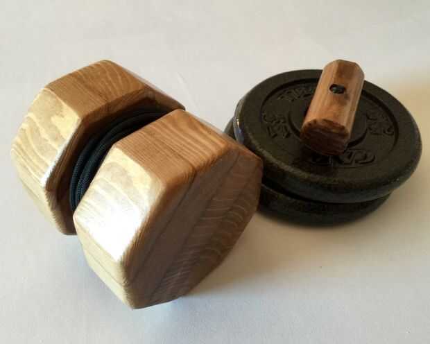 Para añadir peso al rodillo de la muñeca, usted puede atar a cualquier cosa. Una jarra de leche de un galón llenada de agua funcionan bien. Pesas de barra, y razón por la cual hice el pin. Tuvimos un peso antiguo ahí que fue utilizado por los dueños anteriores de nuestra casa como una casa, por lo usé para uno de los rodillos de la muñeca. El cable es paracord, con un nudo fundido para evitar que se deshilache.