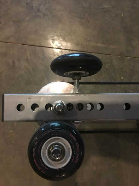 Ahora se montará dos ruedas patines horizontalmente para evitar que la rueda delantera viene de rodillo delantero. Desea que la rueda de patín en contacto con el neumático/llanta de la moto justo detrás del rodillo delantero para que le "nudge" le hacia la línea central.