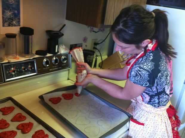 • Poner la masa para galletas en una manga pastelera con una punta redonda grande y llenar corazones trazada en pergamino.