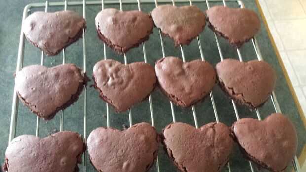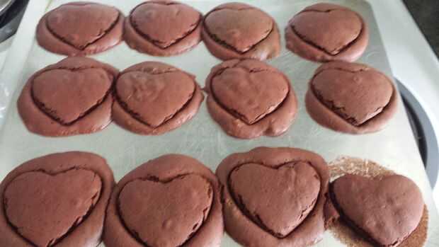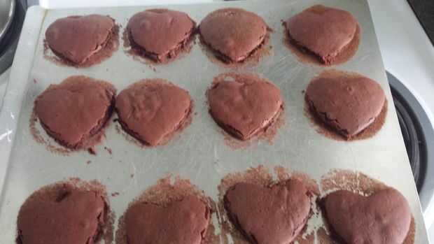 Cuando usted toma su whoopie pies fuera del horno, permite a fresco de un tiempo, pero no demasiado. Ahora es hora de darle sus whoopie pies la llamarada de un San Valentín! Sacar un corazón con forma de cortador de la galleta y cortar cada uno de lo whoopie pies. Puede tener un guante en la mano que usted está sosteniendo la bandeja con si está todavía caliente. Si no tienes un cortador de galletas, sólo usted puede cortar hacia fuera usando un cuchillo demasiado. Quitar el exceso whoopie y guardarlo para aperitivos ir con cualquier izquierda sobre el relleno. Ahora puede desmoldar los whoopie pies y moverlos a una rejilla para enfriar. Aprendí que es una buena idea para no apilar los whoopie pies uno encima del otro, ya que esto causará que clase de palo unos a otros. Un pedazo de papel pergamino entre las capas es una buena solución.