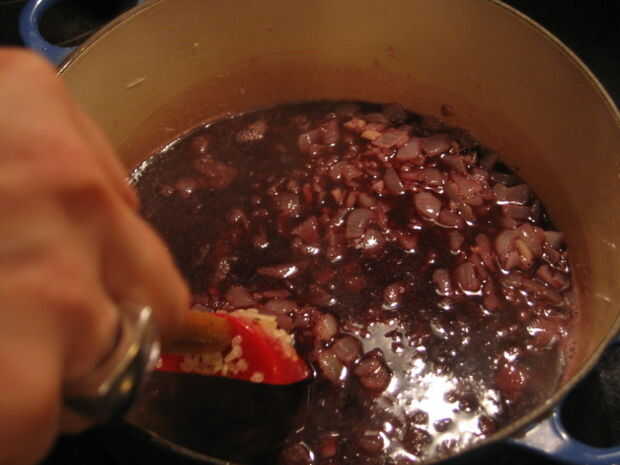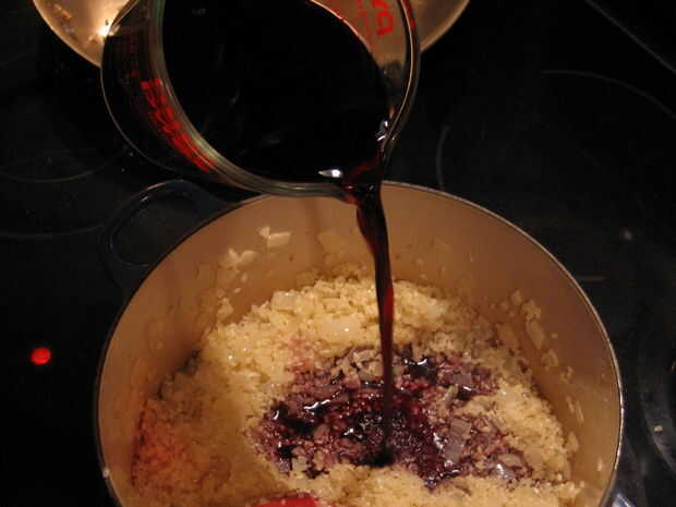 Agregar el vino y revolver bien. Ajustar el calor para que el arroz burbujea bien, pero no con furia hirviente. Usted debe ser capaz de a pie y a darle un revolver cada 2 o 3 minutos.