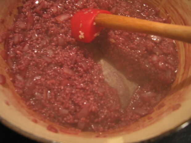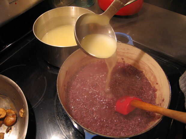 Ahora a añadir el caldo caliente en tandas de 1 taza cuando el líquido ha cocinado sobre todo apagado, pero el arroz no se pegue a la cacerola (cada 5 minutos o menos). Creo que esta es la parte intimidante, pero usted no puede realmente estropearlo a menos que lo dejas palo y quemadura. Para el primer par de adiciones debería poder ver el fondo de la olla cuando es el momento de añadir más (ver imagen abajo). También he visto recetas que sólo todas las acciones de la descarga y se revuelva con frecuencia (que dicen ser tan buenos, pero nunca he probado esto).