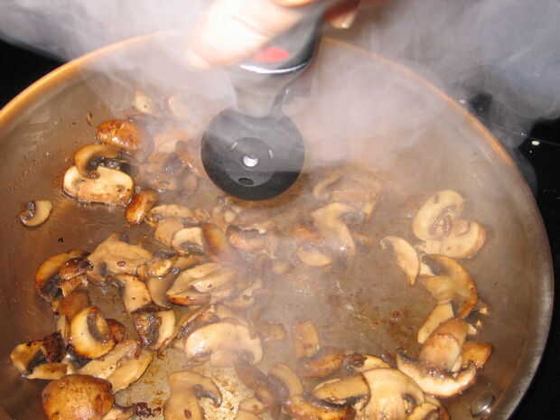 Mientras que va el risotto, saltear los champiñones en una sartén caliente con 1 T de mantequilla hasta que estén dorados. Esta foto muestra que tenía splash en un poco de agua porque mis setas se se pegue a la cacerola. También levantó algunos de los pedacitos dorados buena (eso es todo deglazing es), pero es opcional.