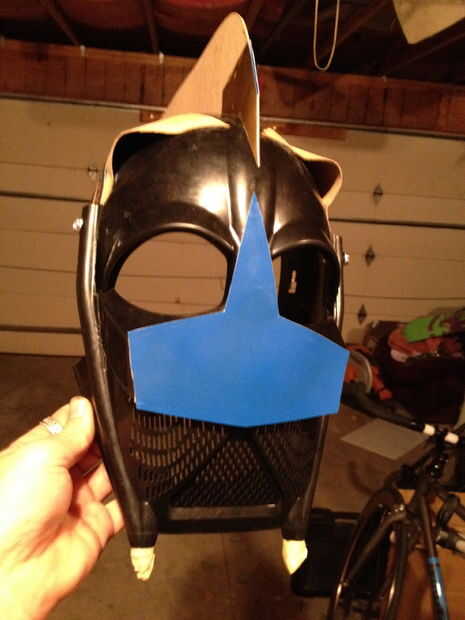 Luego pegan dos pedazos de cartón y cortar la forma de la aleta de la parte superior de la máscara. Corte una abertura en la parte superior de la máscara y me resbaló la aleta en. Luego lo pegan en el interior de la máscara.
