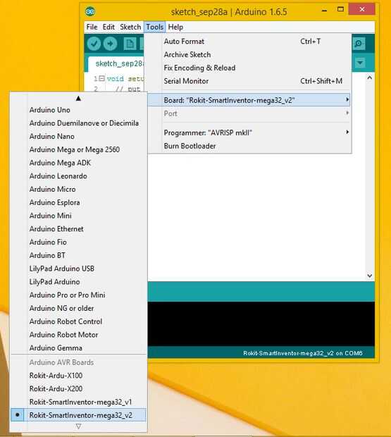 6. Haga clic en la ficha "Herramientas" para seleccionar la versión de la placa principal que está utilizando. El tablero principal puede tener una etiqueta verde que indica que tienes la tabla de versión 2. Si falta la etiqueta verde, tiene un tablero de la versión 1. Seleccione Rokit-SmartInventor-mega32_V1 o Rokit-SmartInventor-mega32_V2.