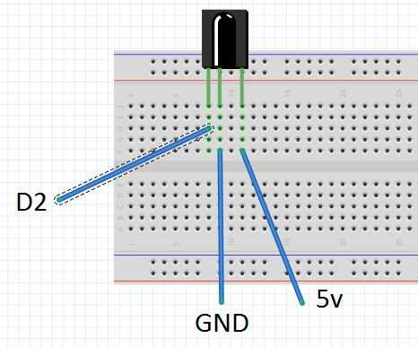 Ahora queremos conectar nuestro circuito receptor IR. Se trata de un circuito bastante básico. Siga el diagrama de arriba. He incluido un esquema más formal, junto con un diagrama visual de ayuda.