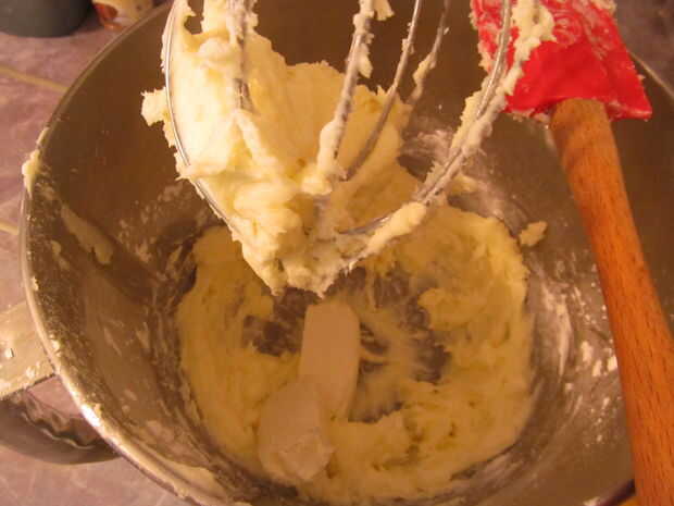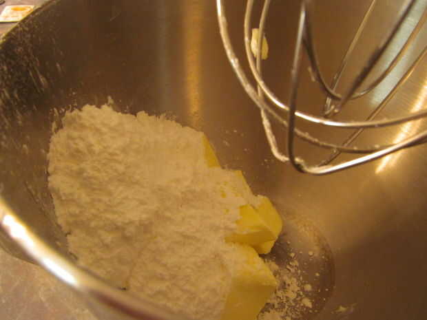 Primero quiere crema la mantequilla y el azúcar en polvo junto con un mezclador.