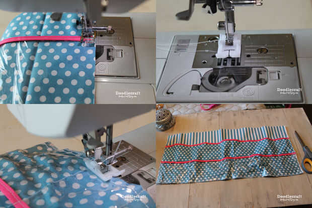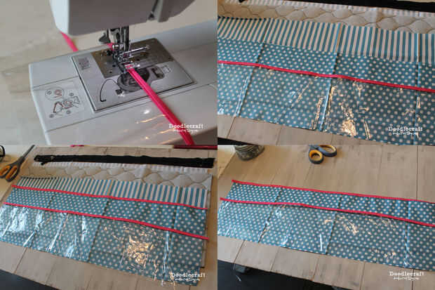 Comenzar cosiendo la cinta de bies doble en el borde superior de vinilo transparente