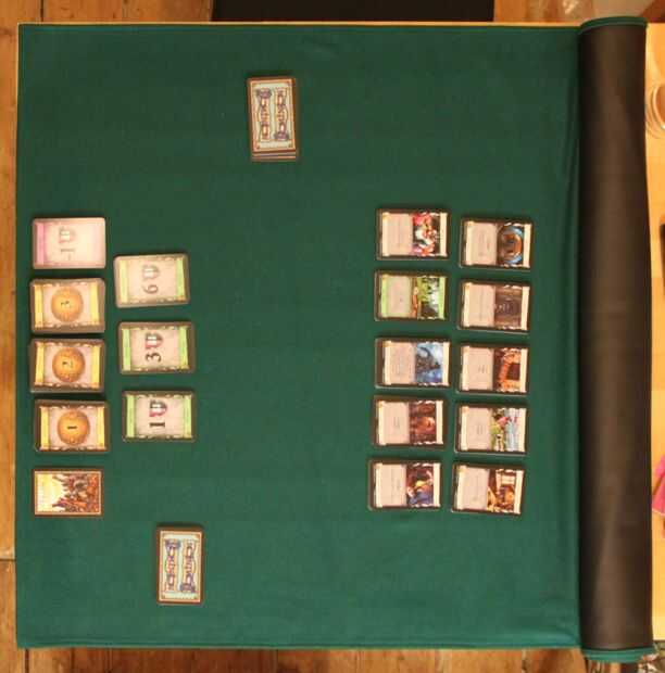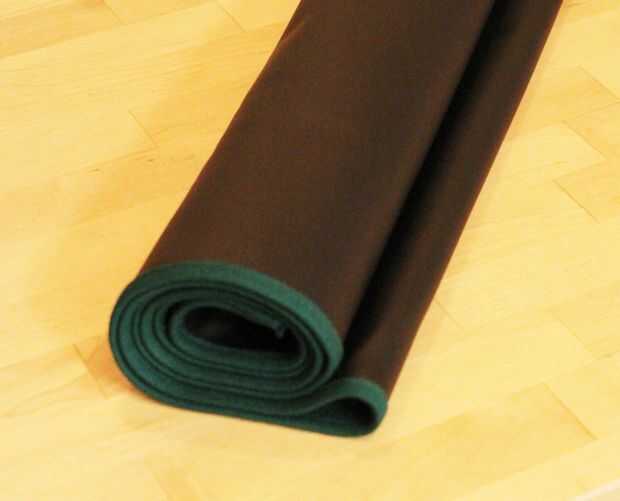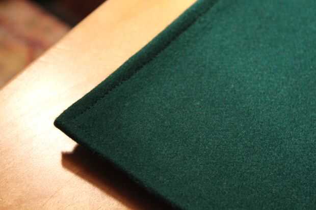 esto puede ser de interés si usted vive en algún lugar con poco espacio pero quisiera tener una buena superficie para poner sobre una mesa para juegos de naipes o juegos de mesa.  Al parecer es bastante común para las personas a comprar un rollo de fieltro para poner hacia fuera como un mantel para este propósito, pero pensé que esto sería patinar alrededor o ser demasiado fácil tirar alrededor accidentalmente, especialmente si se superpone al borde de la mesa.  Por lo tanto, suturan pedazos de fieltro y cuero para producir una superficie que es posible del roll-up para el almacenamiento y también proporciona una superficie lisa y estática para jugar juegos en.