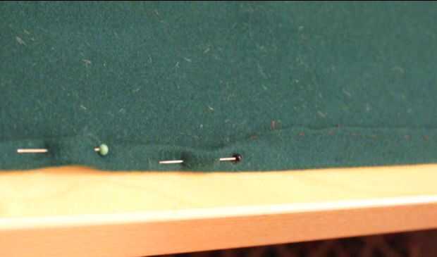 Ahora doble a lo largo de la línea de pliegue de la segunda, metiendo debajo de modo que el borde coincida con el primer pliegue, y pin en su lugar. (La imagen muestra un primer plano de este proceso a medio camino a lo largo de un lado. Nota que cuando tomé esta foto, accidentalmente le ha podido poner el pin a través de la capa inferior: los pernos deben pasar a través de los tres!)