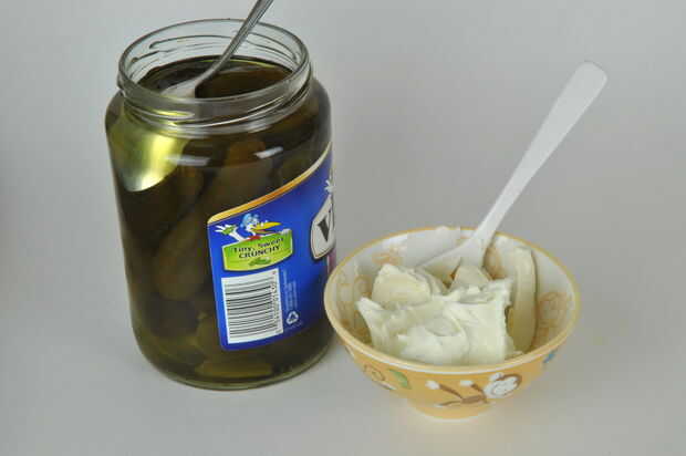 Tomar el queso y poner en un cuenco.  Mush up un poco por lo que no es demasiado duro.  Algunos de su jugo de pepinillo Vierta en el bol con el queso crema y mezclar juntos.