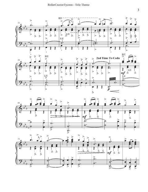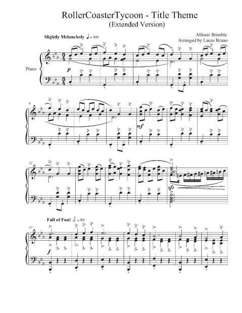 De todos modos, en homenaje al increíble juego y su música impresionante que es tan inspirador y edificante de muchas maneras, arregló un solo de piano completo para el tema del título principal para los primeros juegos de RollerCoasterTycoon. Concretamente la versión de lujo con los packs de expansión adicional (uno personalmente jugué).