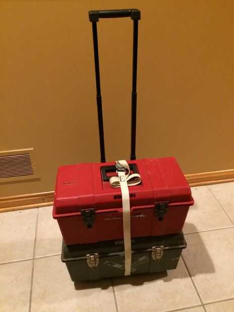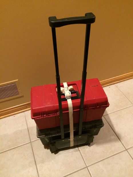 Ahora listo! Mi apilables cajas de herramientas caben bien en el marco y quedarse, incluso al levantar y sacudir la cosa. Mi correa es suficiente que yo sea capaz de encajar tres cajas de herramientas. Ahora mi equipo se puede transportar fácilmente a cualquier parte lo necesito!