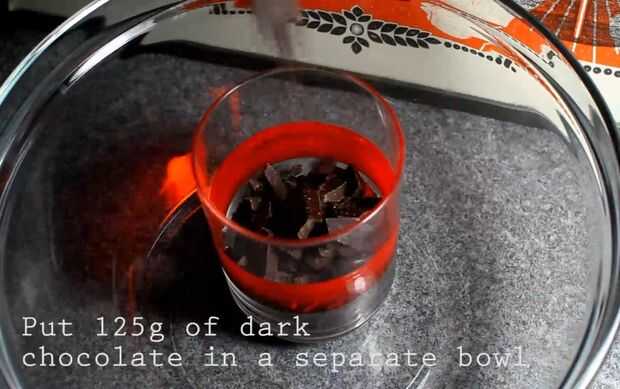 En un recipiente aparte, añadir 125g de chocolate negro y derretir