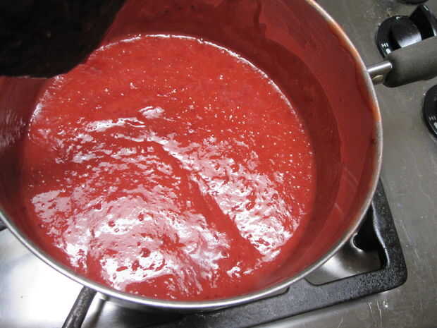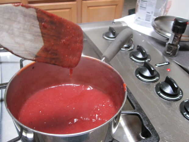 Debe llegar bastante gruesa. Que desea estar hirviendo durante unos minutos. El objetivo es llegarlo suficientemente gruesa como para el punto de no extenderá demasiado cuando usted vierte sobre una superficie plana. Te darás cuenta que es más lento llenar el espacio cuando lo mueve, y todos caerán en grupos.