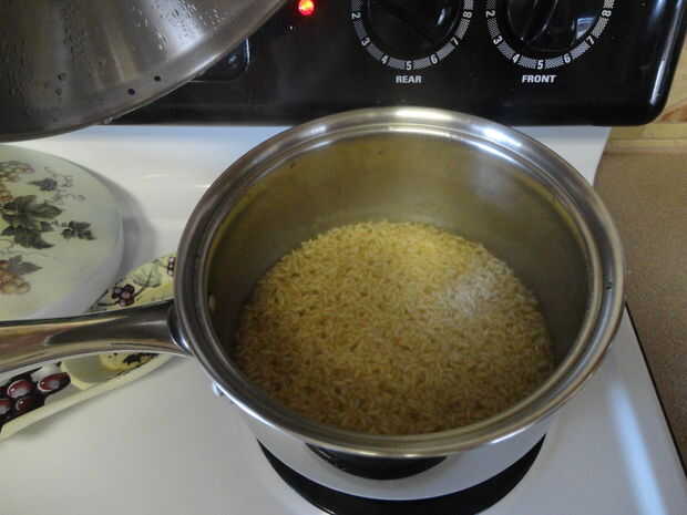 Cocinar el arroz según las instrucciones del paquete con 1 taza de caldo de pollo y 1 taza de agua. Arroz blanco se cocina rápidamente en unos 20 a 30 minutos. Pero el arroz integral tarda unos 15 minutos más para cocinar.