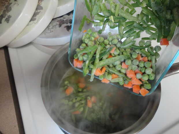 Mientras se cocina el arroz, en una cacerola pequeña poner 1 taza de caldo de pollo hasta que hierva. Agregue verduras congeladas y girar a la baja el calor. Cocinar a fuego lento 2 a 3 minutos. Sólo permitiendo hortalizas para descongelar y calentar. Quite de calor y cuchara vegetales en un tazón mediano y reservar.