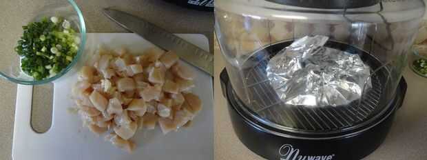 a continuación, cortar en cuadritos la cebolla verde y cortar pechuga de pollo en trozos.